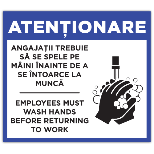 Autocolant de avertizare pentru spatii comerciale, restaurante, unitati alimentare sau locuri de munca unde igiena este obligatorie. Afisul reaminteste angajatilor, in romana si engleza, obligatia de a se spala pe maini inainte de a reveni la lucru. Include un simbol grafic sugestiv, al spalarii mainilor, pentru vizibilitate maxima. Este ideal pentru bucatarii, toalete, zone de preparare a alimentelor si alte spatii in care igiena personalului este esentiala.