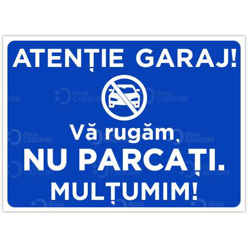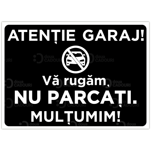 Panou de avertizare pentru garaje. Mesajul sau este "Atentie garaj! Va rugam, nu parcati. Multumim! " iar pictograma reprezinta o masina si un cerc taiat.