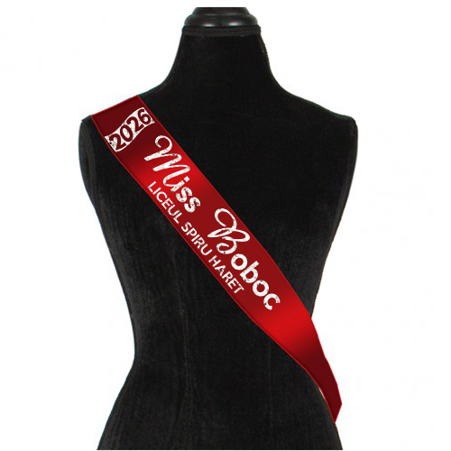 Panglica personalizata pentru castigatoarele concursului de Miss (Boboc, de exemplu). Culoarea textului va avea acelasi ton cu cel al designului selectat.
