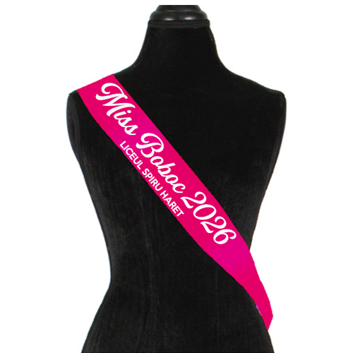 Panglica personalizata pentru castigatoarele concursului de Miss (Boboc, de exemplu). Culoarea textului va avea acelasi ton cu cel al designului selectat.