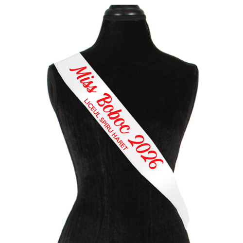 Panglica personalizata pentru castigatoarele concursului de Miss (Boboc, de exemplu). Culoarea textului va avea acelasi ton cu cel al designului selectat.