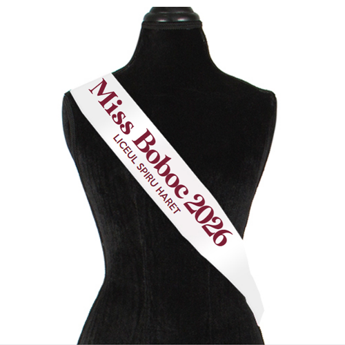 Panglica personalizata pentru castigatoarele concursului de Miss (Boboc, de exemplu). Culoarea textului va avea acelasi ton cu cel al designului selectat.