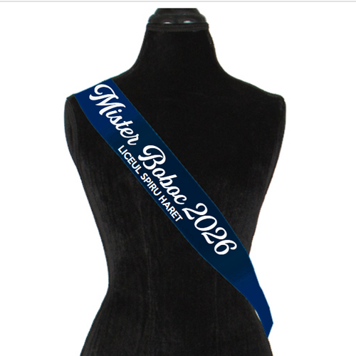 Panglica personalizata pentru castigatoarii concursului de Mister (Boboc, de exemplu). Culoarea textului va avea acelasi ton cu cel al designului selectat sau va fi diferita daca asa doriti.
