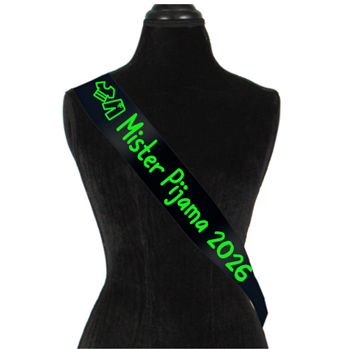 Panglica pentru Mister Pijama cu un font haios, decorata cu o pijama.